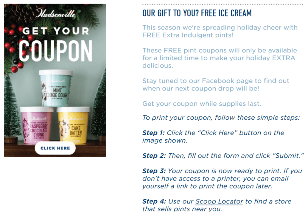 - Hudsonville Ice Cream is offering a free pint of ice cream when you fill out your details