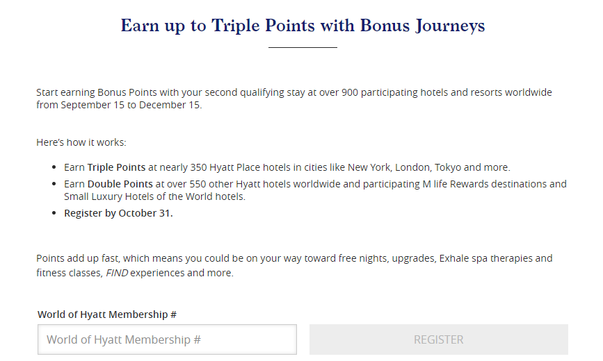 - Hyatt’s latest promotion is now available for registration. The promotion is valid on stays completed from September 15th until December 15th and bonus points are as follows (these begin on your second qualifying stay):