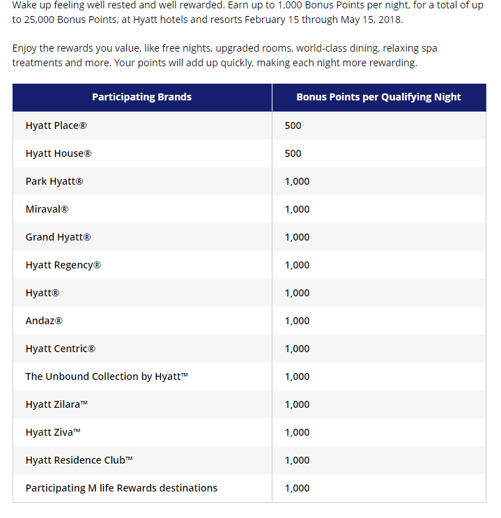 - Hyatt has a new promotion where you can earn up to 1,000 points per night on stays from February 15th until May 15th, 2018. You need to enroll for this promotion before earning starts. The earning rates are as follows: