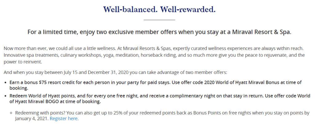 - Earn a bonus $75 resort credit for each person in your party for paid stays. Use offer code 2020 World of Hyatt Miraval Bonus at time of booking.
