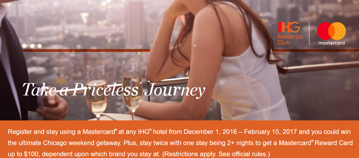 - Register for this promotion and stay using a Mastercard between December 1st, 2016 – February 15th, 2017, stay twice (one stay needs to be 2+ nights) and receive a Mastercard Rewards Card up to $100 (depending on the brand you stay at).