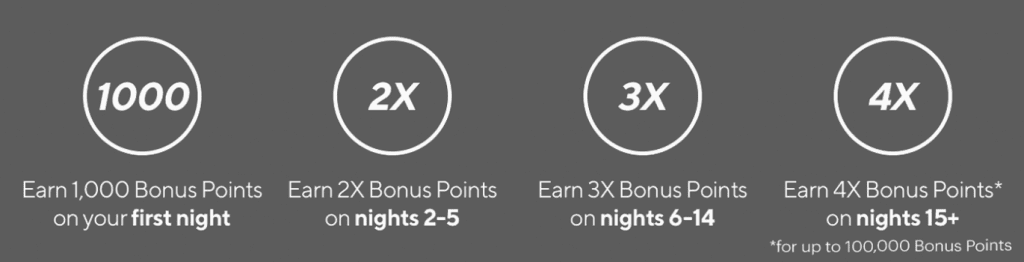 - On your fifteenth night and all future nights during the Promotion Period, you will be awarded quadruple points for up to 100,000 points.