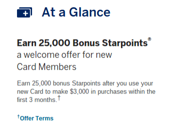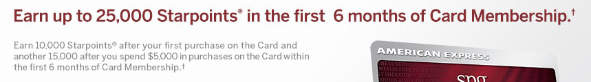 - Signup for the Starwood Amex personal card and receive 25,000 bonus points after spending $3,000 in 3 months. This is the standard offer that’s currently available via the Amex website.