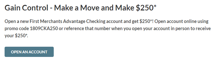 - First Merchants Bank is offering a bonus of $250 when you open a new checking account and complete the following requirements: