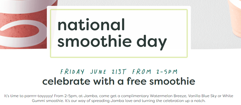 - Jamba is offering a free smoothie for national smoothie day, available from 2PM until 5PM