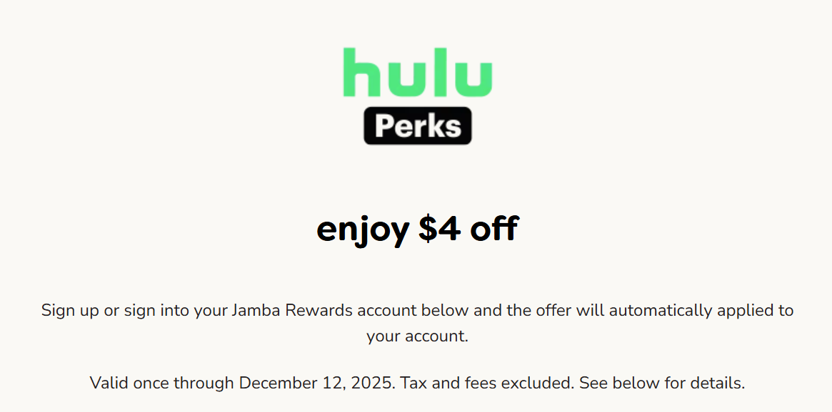 Jamba Juice: Free $4 Credit (Valid Through 12/12) December 4, 20250 Commentsby William Charles Contents1 The Offer2 Our Verdict The Offer Direct link to offer Jamba Juice is offering a $4 credit when you login. Valid through 12/12 Our Verdict Not a huge freebie but might be useful to some of you.