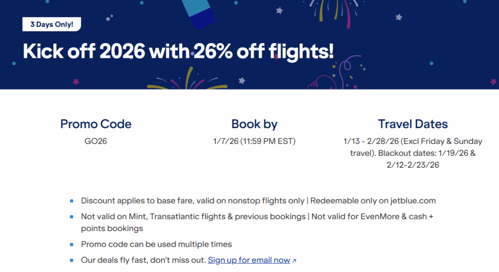 - JetBlue is offering 26% off base fares when you use promo code GO26