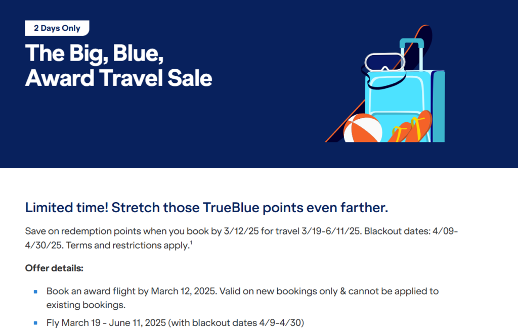 [Expired] JetBlue: Award Sale From 1,900 Points March 12, 20254 Commentsby William Charles Contents1 The Offer2 Our Verdict The Offer Direct link to offer JetBlue is having an award sale from 1,900 points. Book an award flight by March 12, 2025. Valid on new bookings only & cannot be applied to existing bookings. Fly March 19 – June 11, 2025 (with blackout dates 4/9-4/30) Our Verdict