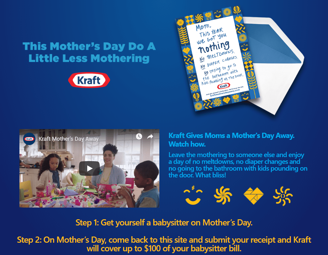 - Kraft is offering to pay for a baby sitter for mother’s day and will provide a rebate of up to $100.