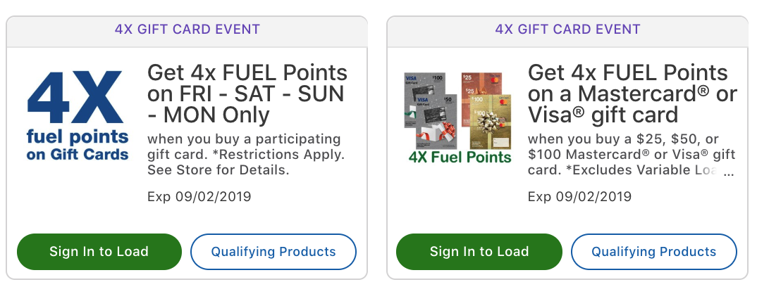 - Save a digital coupon to get 4x fuel points on Visa and Mastercard $100, $50, or $25 fixed-value gift cards.