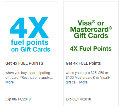 - Save a digital coupon to get 4x fuel points on Visa and Mastercard $100, $50, or $25 fixed-value gift cards. Valid until 8/14/18