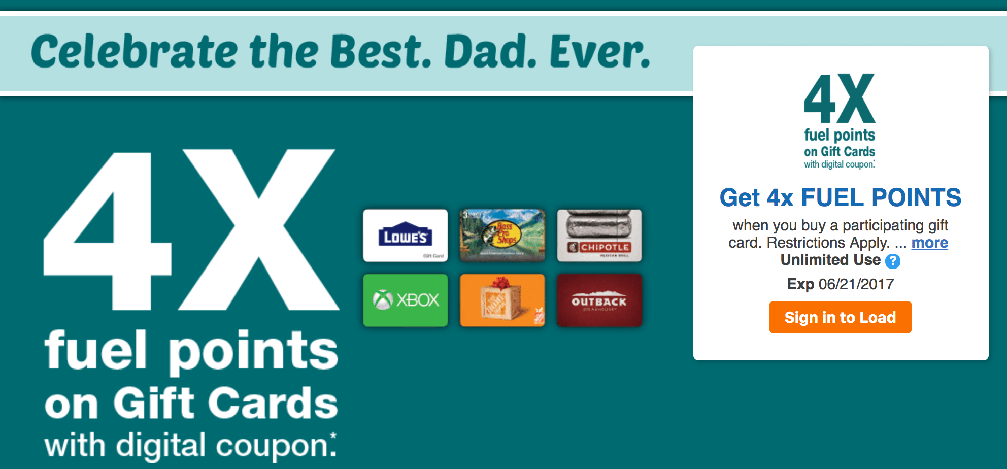 The standard deal at Kroger is 2x fuel points on gift card purchases, and they’ll occasionally release offers like this one to get 4x fuel points. Login to your online account to find the coupon at your local store and load it to your card.