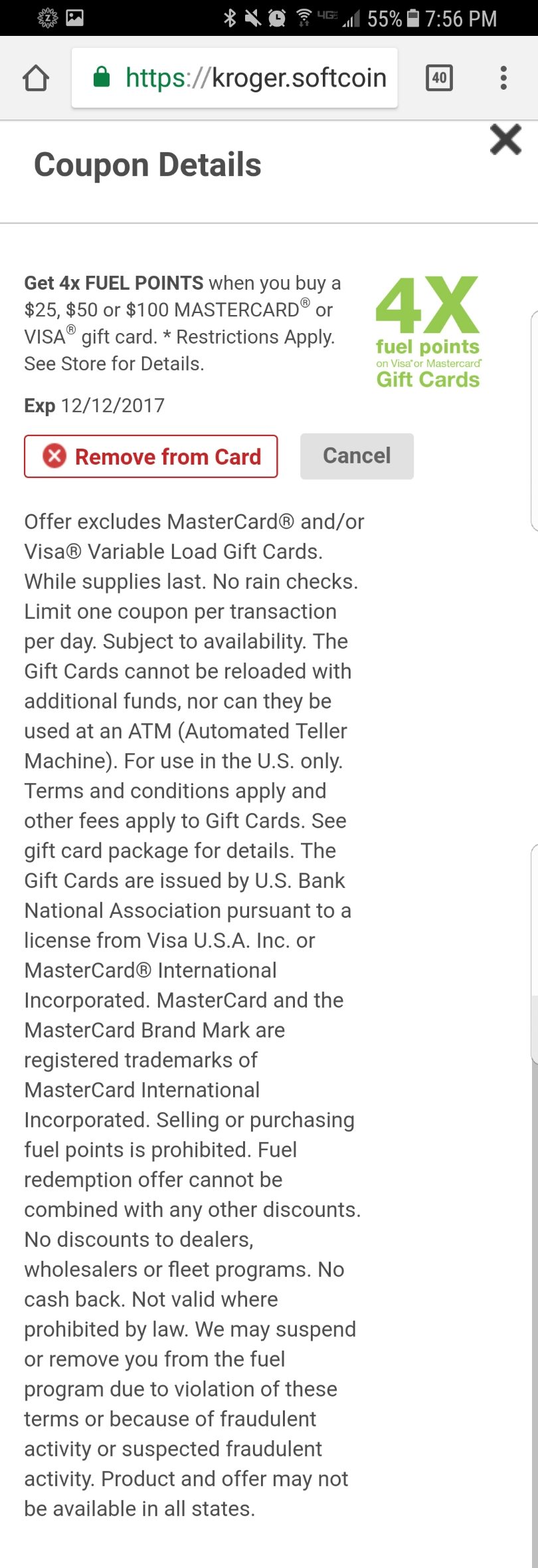 - Get 4x fuel points on $100, $50, and $25 denomination Visa and Mastercard gift cards until December 12th, 2017