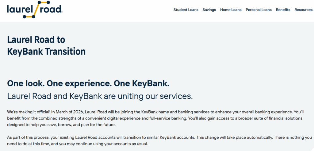Laurel Road has announced its joining Keybank and existing Laurel Road accounts will be transitioned to Keybank accounts. Laurel Road has been apart of Keybank since 2019 but will transition to the Keybank branding etc in March 2026.