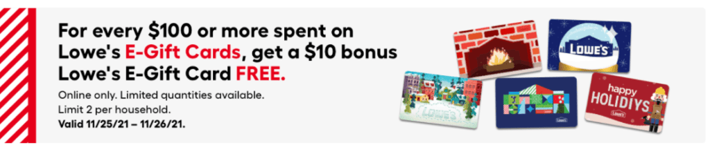 - Lowe’s is offering a $10 free e-gift card when you buy $100 Lowe’s e-gift card.