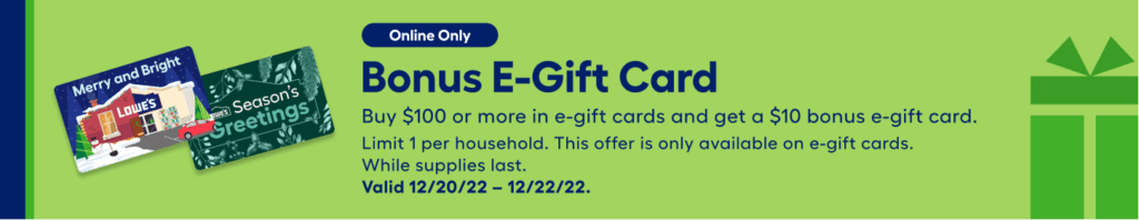 - Purchase $100 Lowe’s Giftcard & Get $10 Lowe’s Giftcard For Free