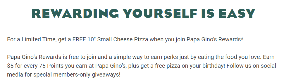 - Free Small Cheese Pizza promotion is valid for new Papa Gino’s Rewards Members only.