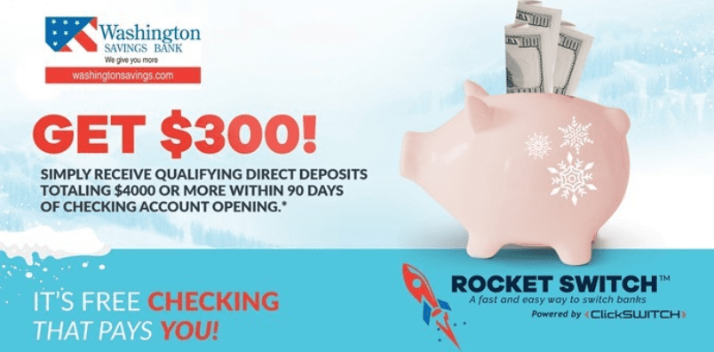 - Washington Savings Bank is offering a bonus of $300 when you open a new checking account and complete the following requirements:
