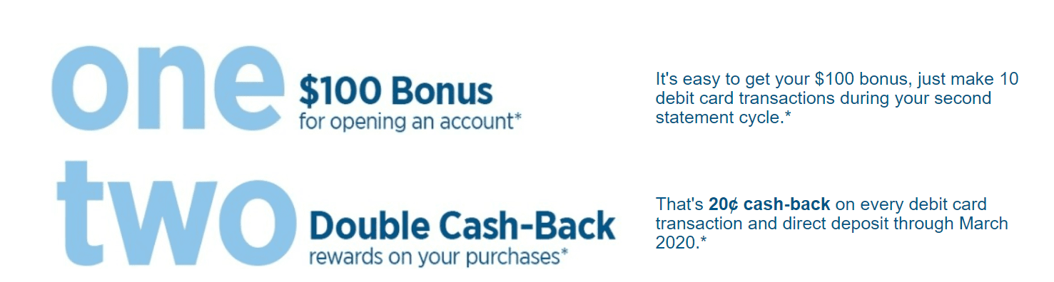 - If you make 10 debit card point-of-sale transactions in the second statement cycle, a $100 bonus will be paid within 60 days of meeting requirements. To be eligible for cash-back rewards you must sign up for eStatements and have direct deposits of $500 or more, of your payroll, pension or government benefits, such as Social Security.
