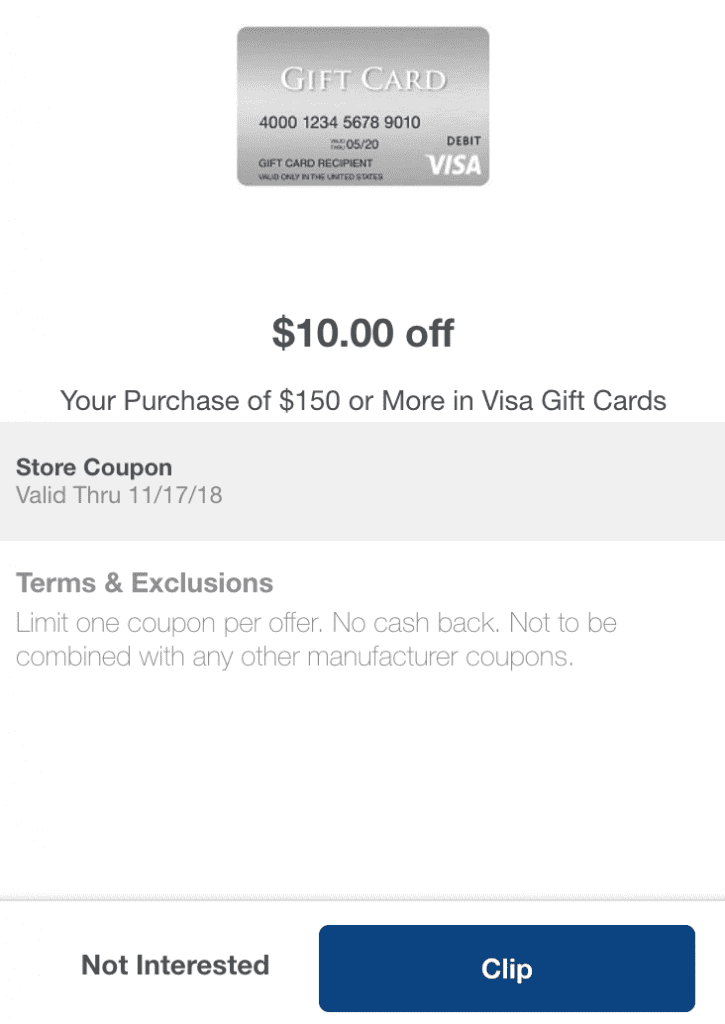 - Meijer has a coupon available which gives $10 off when you purchase $150 or more in Visa gift cards.