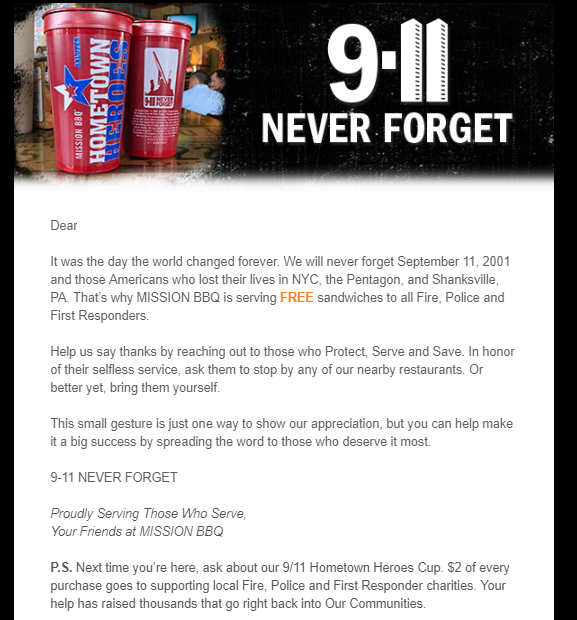- Mission is offering free sandwiches to all Fire, Police and First Responders