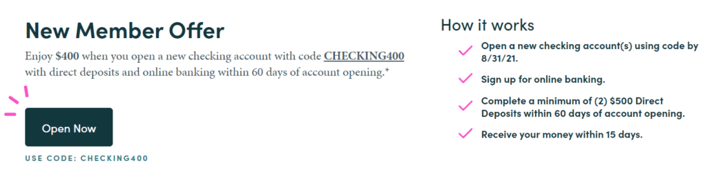 - Earn a $400 bonus when you complete the following requirements within 60 days of account opening: a) Open a new TailorMade, Opportunity, or StepOne Checking Account b) Use the special offer code CHECKING400 at account opening c) Have a minimum of two $500 direct deposits of a paycheck, pension payment, Social Security payment, or other government benefits payment electronically deposited into the account from an employer or outside agency. d) Enroll in Online Banking.