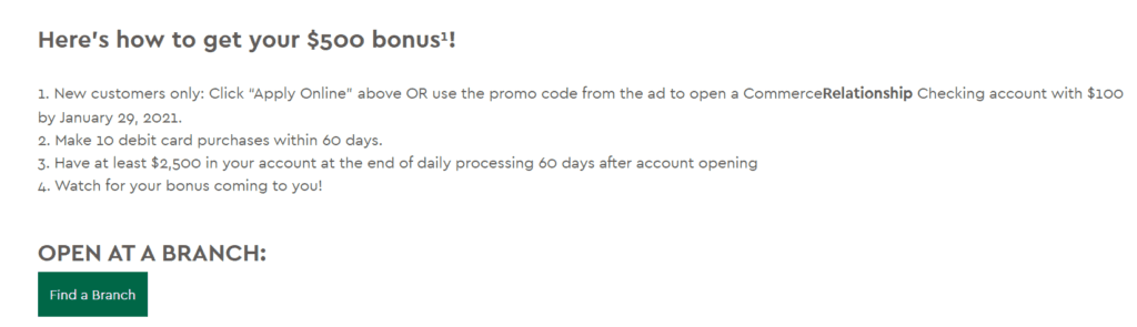 - Limited time offer. Only one offer per household. To qualify for the $500 bonus: a) You must provide the promo code from the advertisement at the time of account opening; b) You must complete at least 10 PIN Point of Sale or signature-based purchases using your associated debit card within 60 days of account opening. ATM withdrawals, pending transactions and withdrawals at a branch using your debit card are not qualifying transactions. Transaction must post to the account within the 60-day period; c) Your CommerceRelationship Checking account must be opened and funded by January 29, 2021; d) 60 days after account opening, the account must have a minimum balance of $2,500 (or the next business day, if 60 days falls on a weekend or bank holiday). The balance will be verified after all transactions, fees and charges have been applied at the end of daily processing; and e) You must be a new customer, meaning one who has not owned a Commerce Bank deposit account in the 60 days prior to account opening. We will determine whether all requirements for the bonus have been met 60 days after account opening (or the next business day, if 60 days falls on a weekend or bank holiday). If you have completed all of the above requirements, your bonus will be paid within 8 weeks by crediting your CommerceRelationship Checking account. Maximum total bonus $500. The bonus will be reported as interest to the IRS. Commerce Bank reserves the right to determine eligibility for offer, and offer may be revoked, restricted, or changed at any time at Commerce Bank’s sole discretion. Monthly service charge waived for first 60 days after new account opening. This 60-day grace period does not apply to existing or converted accounts. To avoid a $20 monthly service fee on the CommerceRelationship Checking account, the primary account holder must maintain a $5,000 average daily balance in that account OR $15,000 in combined Commerce deposit account balances (checking, savings, money market, CDs, and IRAs). The annual percentage yield for CommerceRelationship Checking is 0.01%, as of September 22, 2020. There is no minimum balance requirement to earn the APY. Minimum opening deposit $100. Rate may change after account is opened. Fees could reduce earnings on the account.