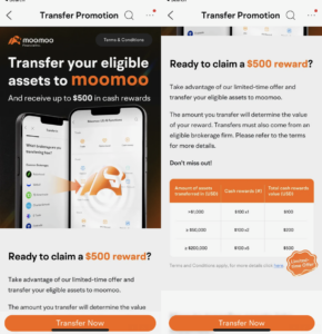 - Transfer Reward Promotion: If, during the Promotion Period, you deposit assets (stock or cash) totaling the amounts shown below, you will be eligible for the rewards also shown below. The cash reward will be credited to your Moomoo Financial Inc. brokerage account within 10 business days after the end of the Promotion Period. If you transfer in HK stock, the accumulated amount of Transfer-In will be converted into USD (7.82 HKD = 1 USD)