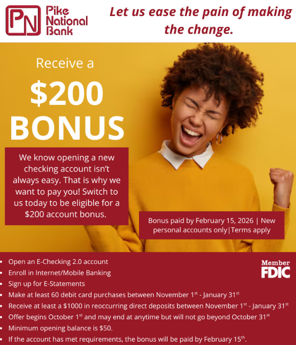 - Pike National Bank is offering a $200 bonus when you open a new checking account and complete the following requirements:
