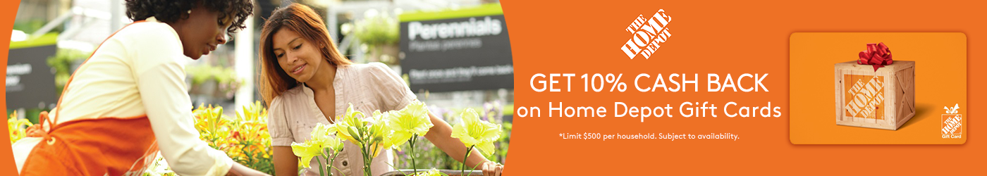 - Mygiftcardsplus is offering 10% back on the purchase of Home Depot gift cards. $500 maximum
