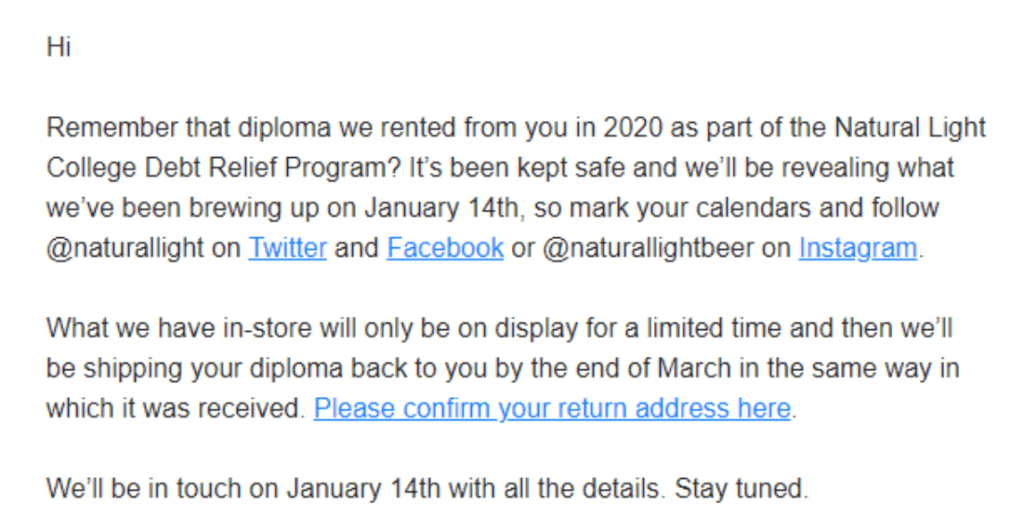 Update 4/22/20: E-mails have been sent out to those who were selected. Payment will be made in the next three weeks. The e-mail subject line is ‘Natty Light Diploma Rental’