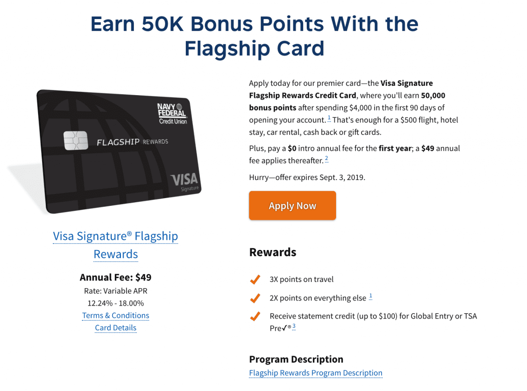 - Signup for the Navy Federal Flagship Rewards Visa Signature card and get 50,000 points after spending $4,000 within 90 days.
