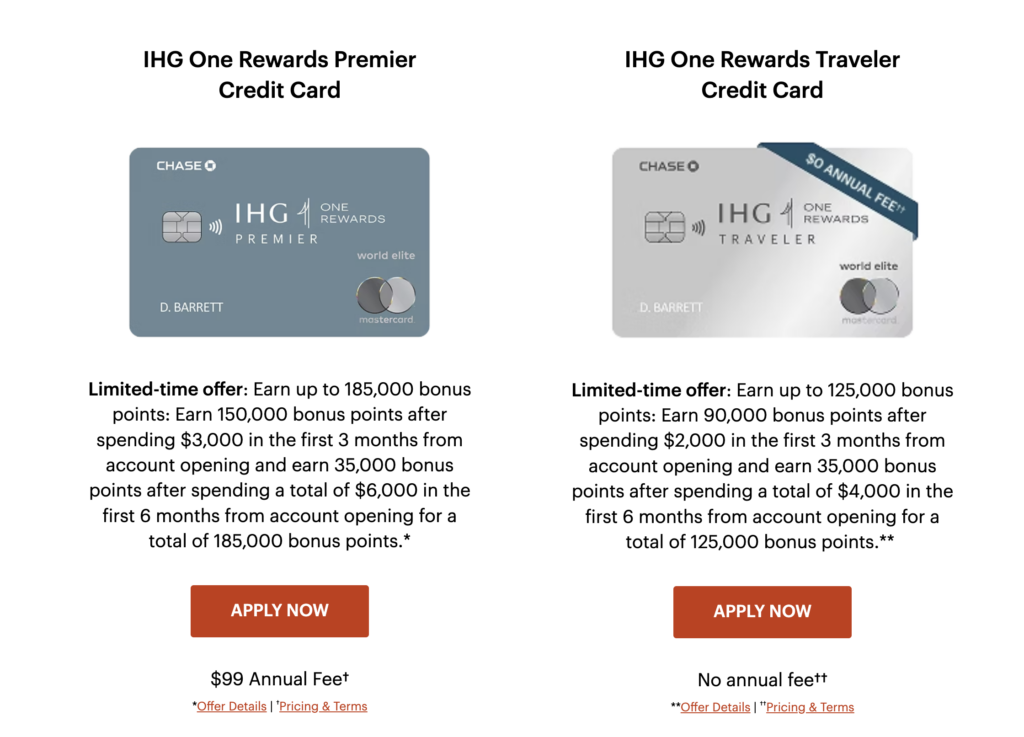 - IHG Premier – Earn up to 185,000 bonus points: Earn 150,000 bonus points after spending $3,000 in the first 3 months from account opening + earn 35,000 bonus points after spending a total of $6,000 in the first 6 months from account opening for a total of 185,000 bonus points.