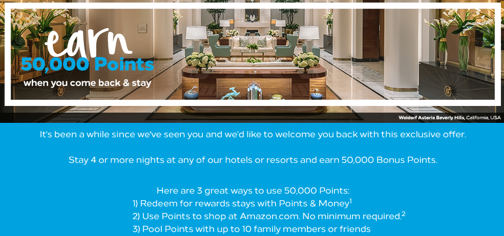 - Hilton almost always has some targeted promotions offering large amounts of Hilton points for completing certain stay requirements. A new batch of bonuses has been sent out, see if you are targeted for any of the following deals: