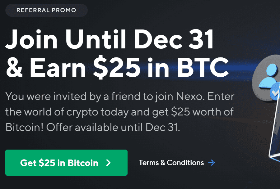 - Nexo is offering a $25 referral bonus in BTC when the person being referred adds at least $100 in supported assets. Person being referred gets $25.
