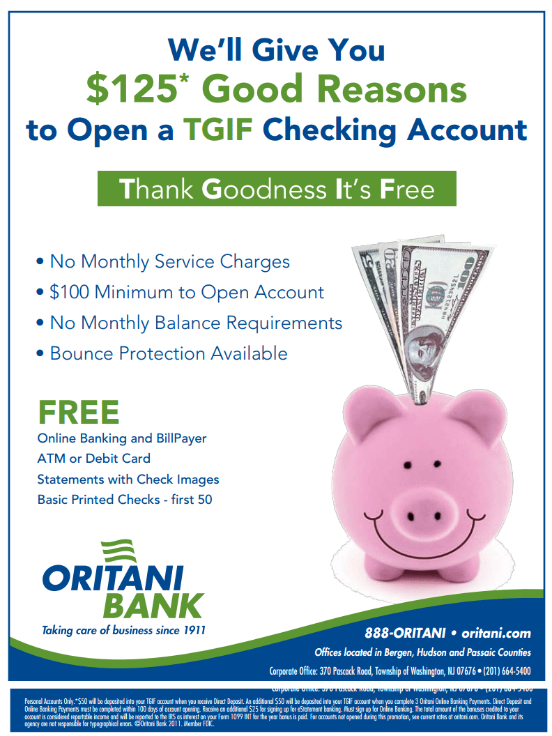 - Receive up to $125 when you open a TGIF account with Oritani bank