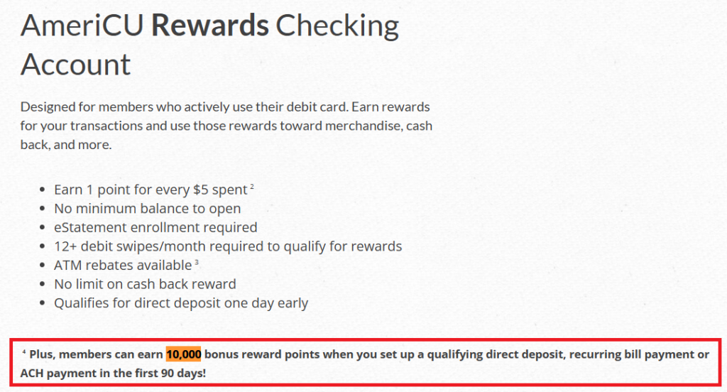 - Open an AmeriCU Credit Union checking account and receive 10,000 points when you set up a qualifying direct deposit, recurring bill payment or ACH payment in the first 90 days
