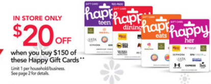- Office Depot/Max is offering a $20Â discount when you purchase $150 in Happy teen, dining, eats or her gift cards
