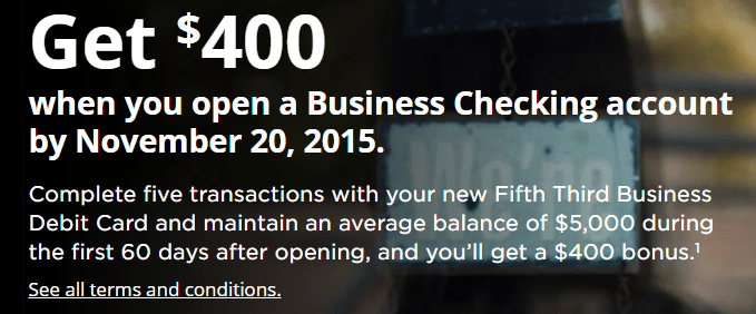 - Receive a bonus of $400 when you complete five transactions with your new Fifth Third Business Debit card and maintain a balance of at least $5,000 for the first 60 days after you open a new business checking account with Fifth Third.