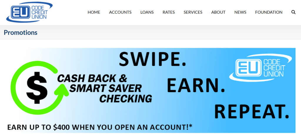 - CODE Credit Union is offering a $400 bonus when you open a new checking account and complete the following requirements:
