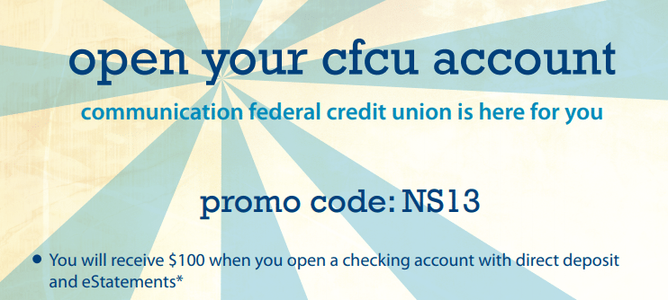 - Communication Federal Credit Union is offering a bonus of $100 when you open a new checking account and complete the following requirements within 60 days of account opening:
