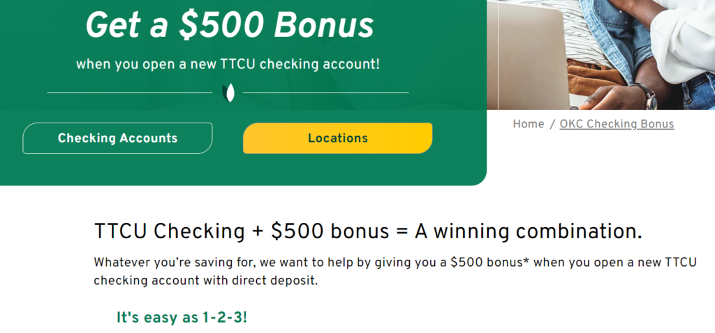 - TTCU is offering a bonus of $500 when you open a new checking account and complete the following requirements: