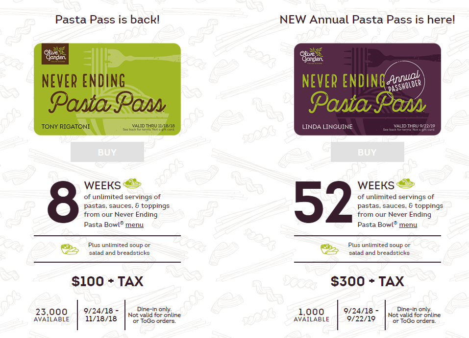 - Olive Garden is bringing back it’s never ending pasta passes. The passes go on sale on 8/23/18 at 2PM ET. This year two passes are on sale: