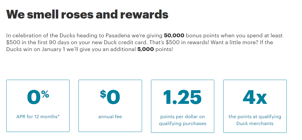 Oregon Community Credit Union (OCCU) offers the Ducks credit card, to celebrate the Ducks heading to Pasadena they are offering a bonus of 50,000 points after $500 in spend within the first 90 days. In addition if the Ducks win on January 1st you’ll receive an additional 5,000 points. Points are worth 1¢ each. Card also has the following benefits: