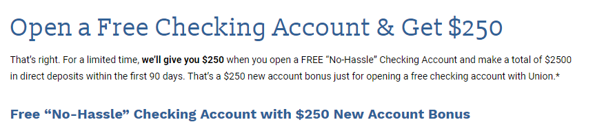 - Open a new Union Community Bank free checking account and get a bonus of $250 when you make a total of $2,500 direct deposits within 90 days of account opening