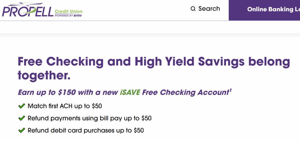 - Propell Credit Union is offering a bonus of up to $150 when you open a new iSave checking account. Bonus is broken down as follows (must be done within 30 days of account opening:
