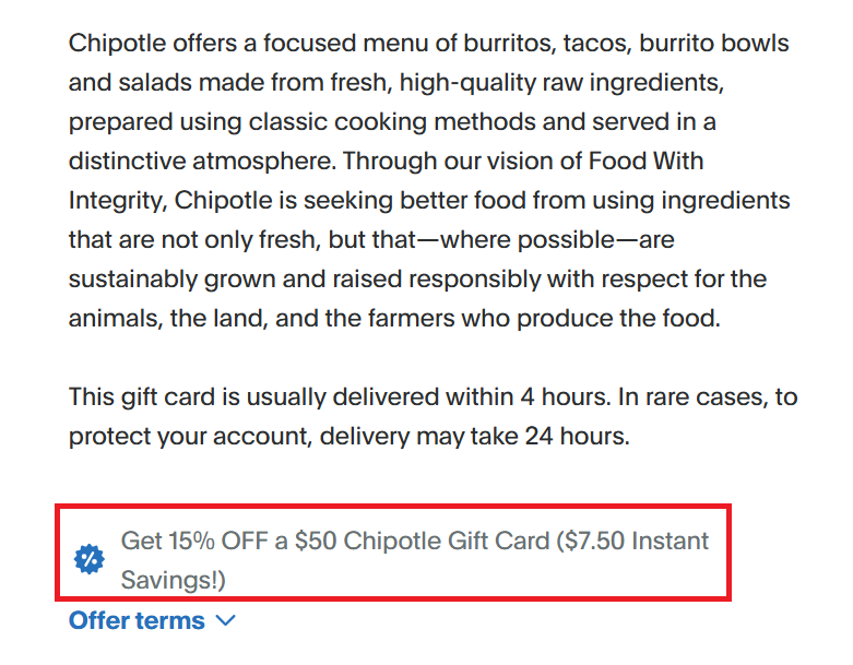 PayPal: 15% Off Chipotle, 20% Off Fandango Giftcards December 1, 20251 Commentby William Charles Contents1 The Offer2 Our Verdict The Offer PayPal has the following gift card deals: $50 Chipotle for $42.50 $25 Fandango for $20 Our Verdict Chipotle probably the more popular of the two options.