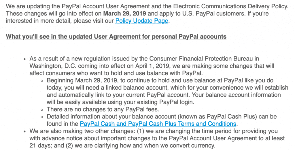 As a result of a new regulation issued by the Consumer Financial Protection Bureau, you’ll need a linked ‘cash account’ to hold the money in your Paypal account. The account will be automatically linked to your Paypal account. They’ll also automatically create the Cash Account for existing users, in many cases. The change will go into effect on March 29, 2019.