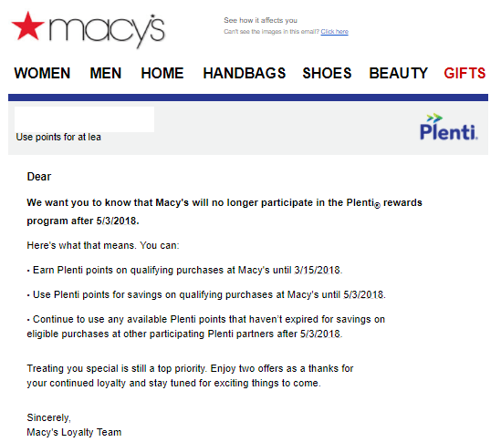 Macy’s/Plenti has sent out an e-mail letting people know that: