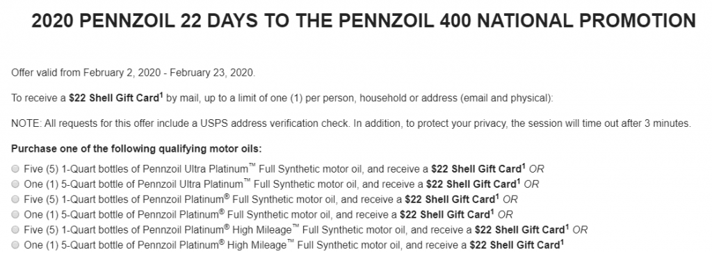 - Pennzoil is offering a $22 Shell giftcard when you purchase select products and submit a rebate. Products are: